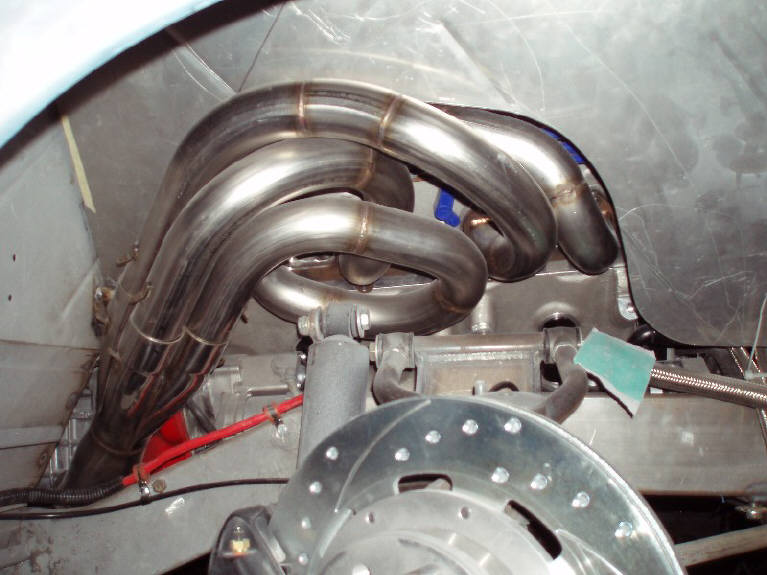 The header system quickly evolved into one of the more complex fabrication challenges of the build. The initial design routed the headers downward, collecting beneath the car. While functional, this approach introduced tight bends near critical components, including the dry sump oil lines, and required notching the firewall to accommodate clearance.